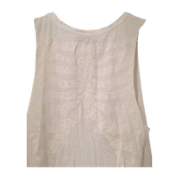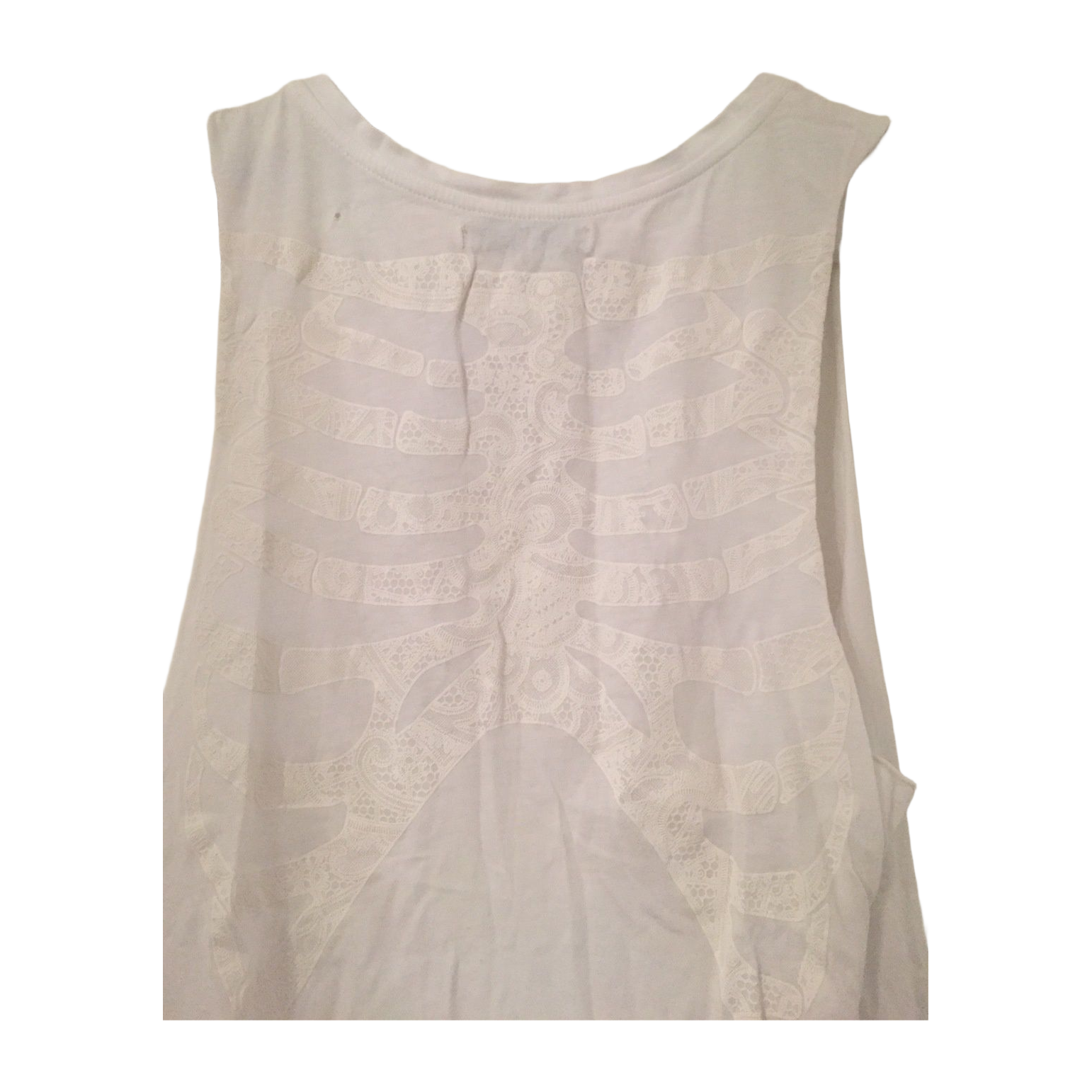Valkoinen toppi, jossa takana valkoisella kuviolla luuranko. Pieni reikä takana, josta kuva.