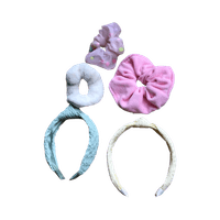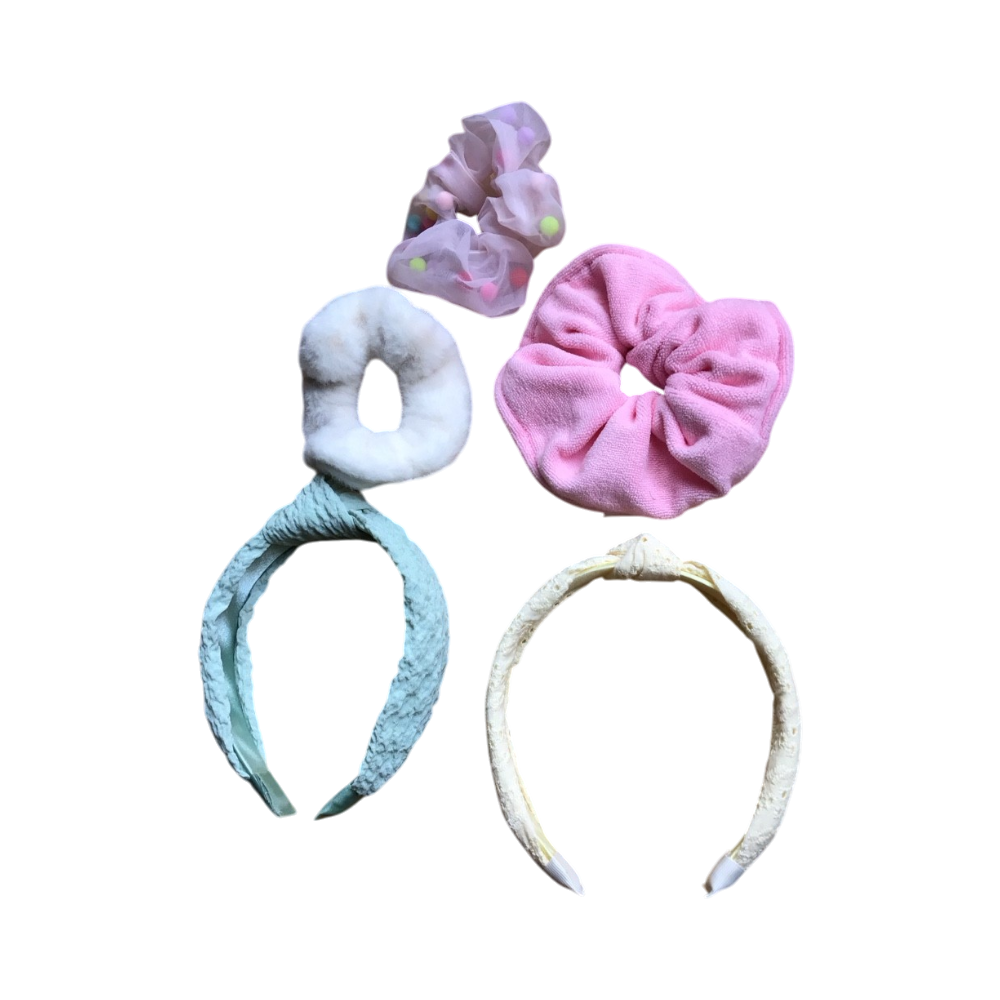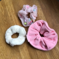 Hiuspantoja 2 kpl, vaalean keltainen ja mintunvihreä. Molempia muutamia kertoja käytetty, oikein hyvässä kunnossa. Hiusdonitseja 3kpl, vaaleanpunainen, valkoinen ja vaaleanpunainen läpinäkyvä jossa sisällä erivärisiä palleroita. Oikein hyvässä kunnossa.