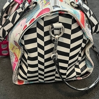 Bulaggi-merkkinen vuoden 2018 malliston citybag💕 Hauska kuosi ja kauniin punainen vuoraus, jossa painatukset❤️ Käytetty ja esimerkiksi lyhyiden kahvojen kiinnikkeiden reunoista musta reunus kulunut pois (kuvat 9&10). Ei kuitenkaan vaikuta käyttöön eikä ole käytössä näkyvä haitta🌸 Muuten siistissä kunnossa ja näkyvät viat huollettu!