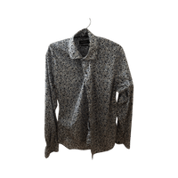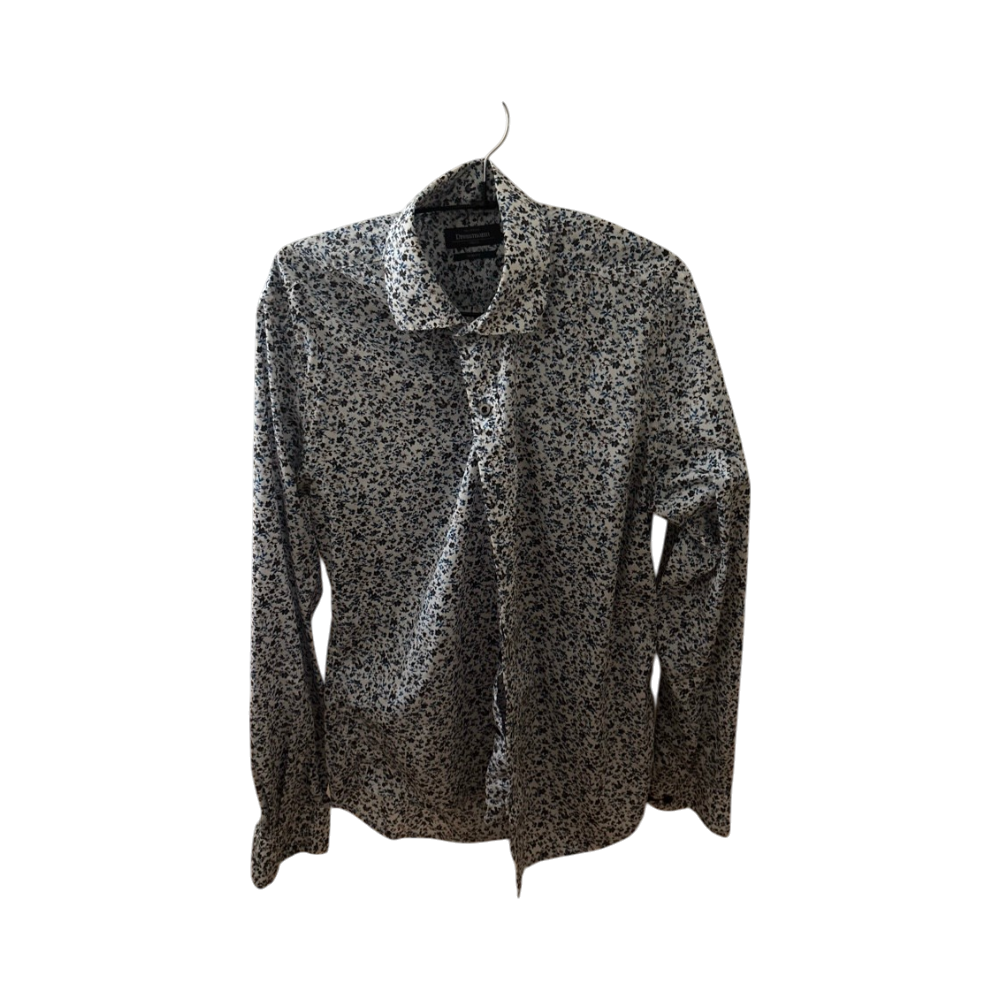 Pitkähihainen nappikauluspaita valkoisella sinisellä kukkakuviolla.