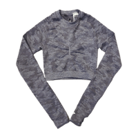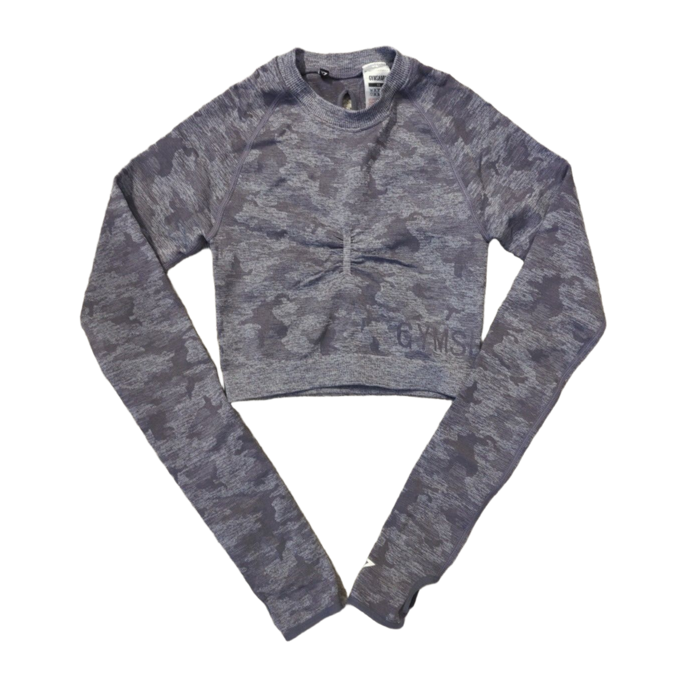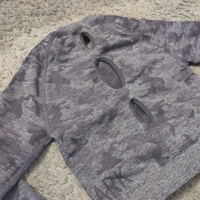 Gymsharkin camo mallistosta oleva seamless long sleeve crop top koossa XS ja tumman laventelisävyssä. Edestä löytyy pieni rypytys ja takaa kolme aukkoa. Hihansuista löytyy peukaloreiät.