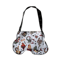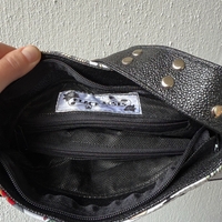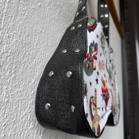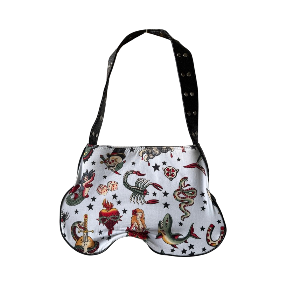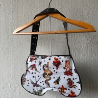 Y2k-tyylinen käsilaukku. Korkeus leveimmästä kohtaa 20 cm, leveys 30 cm ja syvyys 8 cm.