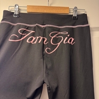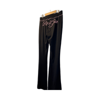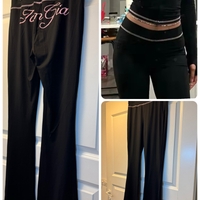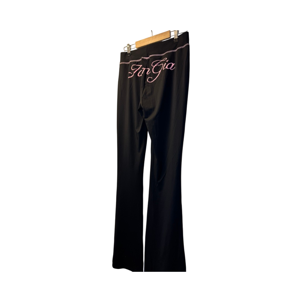 Korkeavyötäröiset mustat flare-housut, pinkki yksityiskohta takana.