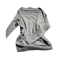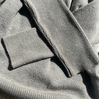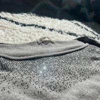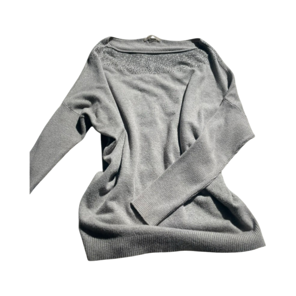 Ohut harmaa neulepusero, koristekivet yläosassa.