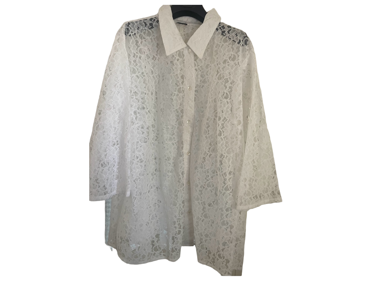 Naisten valkoinen läpikuultava pitsipaita napituksella.