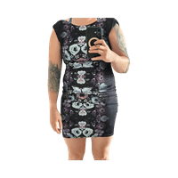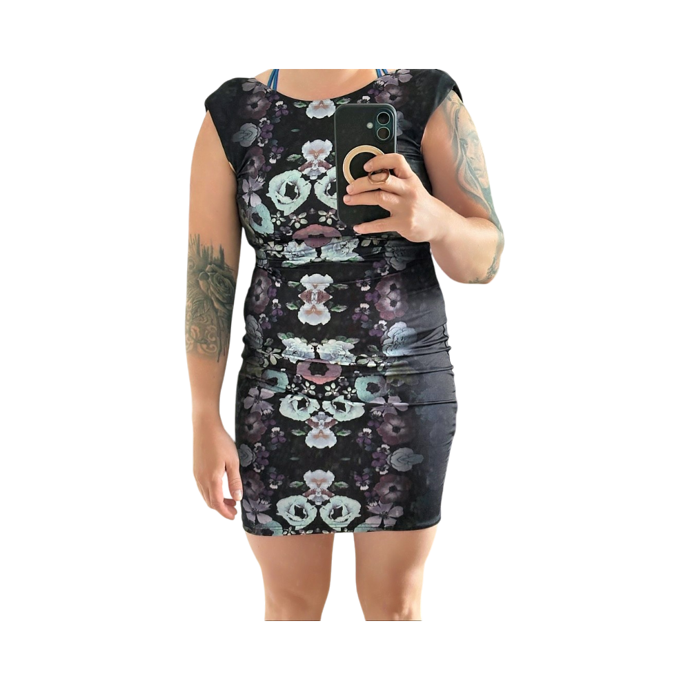 Musta vartalonmyötäinen mekko kukkakuviolla, kokoa S