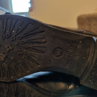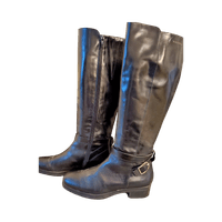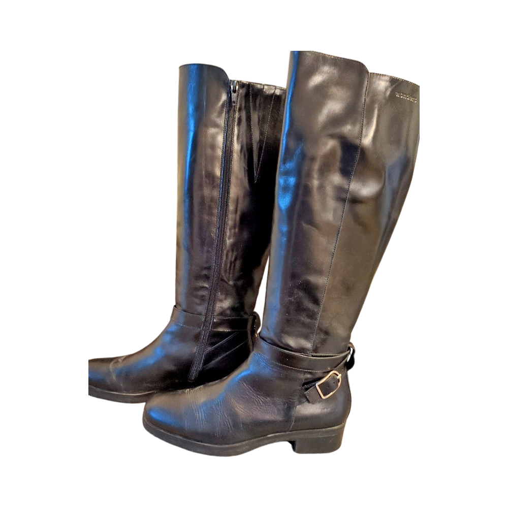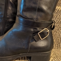 Korkeavartiset mustat nahkasaappaat, hyvässä kunnossa.