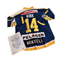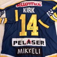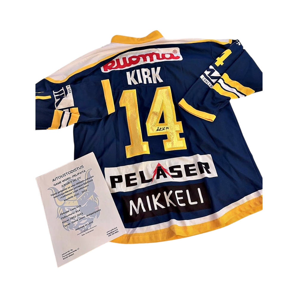 Liam Kirk #14 game worn pelipaita nimmarilla, erinomaisessa kunnossa. Aitoustodistuksen saa mukaan, täydellinen joululahjaksi!