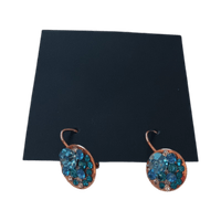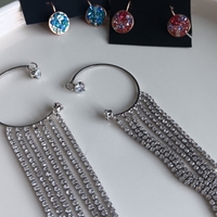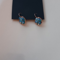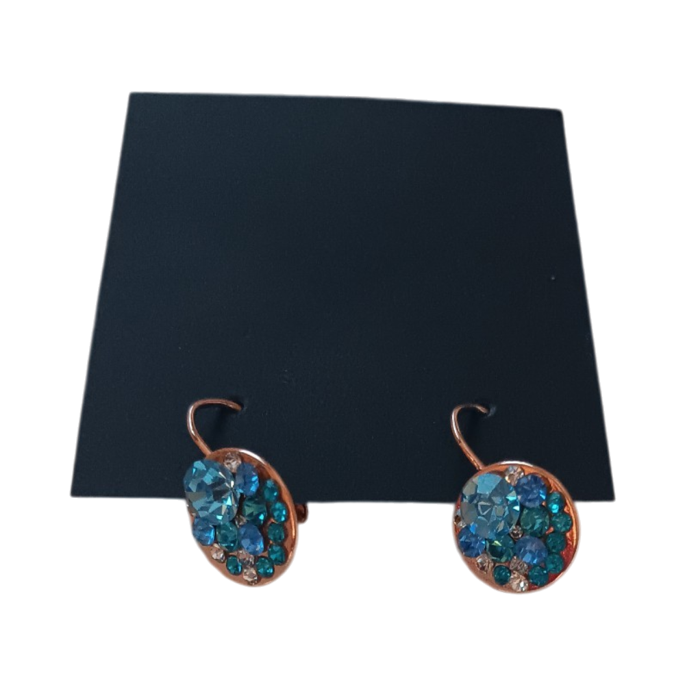 Pyöreät koukku‑korvakorut, sinisiä strassikiviä, ruusukullanvärinen koruosa. Käyttämättömät