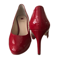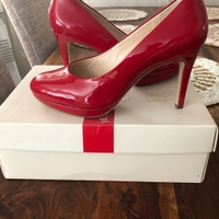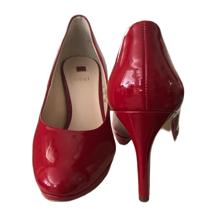 Upeat , kerran sisällä käytetyt plateau pohjaiset juhlakengät. Kiiltävä punainen lakerinahka. Koko 37,5, korko 7 cm ( sisämitta)
