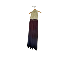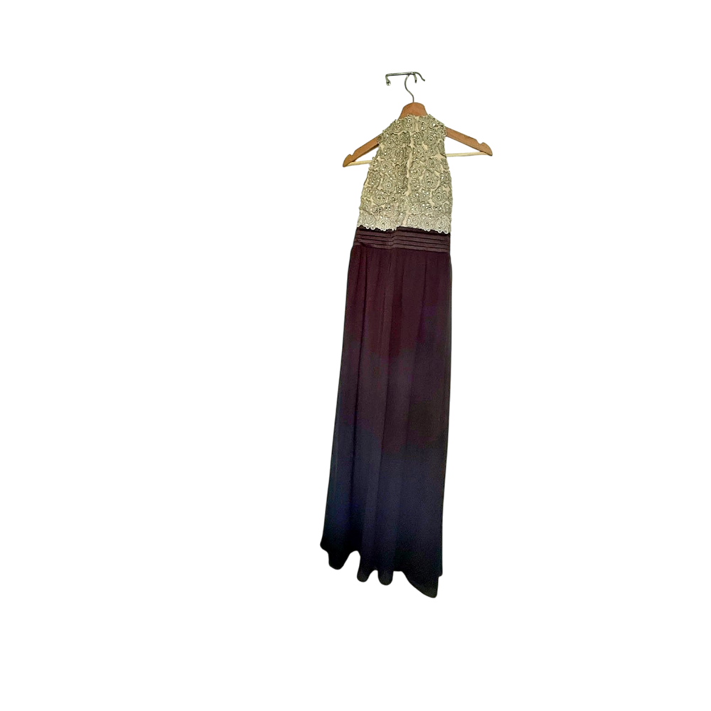 Pitkä juhlapuku, jossa helmikoristeinen yläosa ja musta helma.
