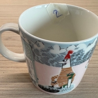 Muumimuki on mielestäni yleisesti muuten erinomaisessa kunnossa, mutta tarra repsottaa vähän (katso kuvat).