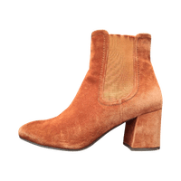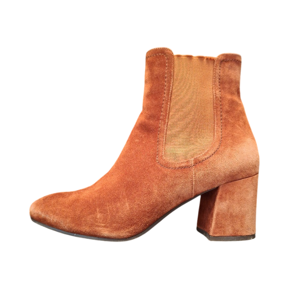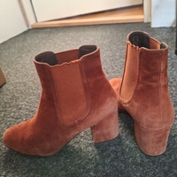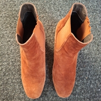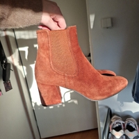 Mokkanahkaiset nilkkurit, korko noin 7 cm, venykkeet molemmilla puolilla nilkkaa. Pohjat hyvässä kunnossa. Sisäpohjalliset saa irti ja voi vaihtaa. Mukavat kävellä. Väri lämmin ruskea, oranssiin taittava.