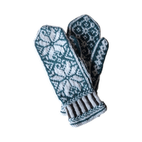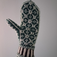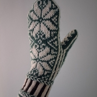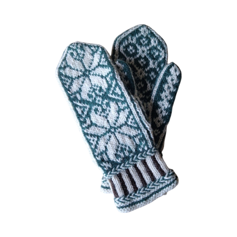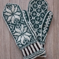 Uudet kösin neulotut kirjoneulelapaset, joissa tummanvihreää mohairsekoitetta ja luonnonvalkoista ja ruskeaa villalankaa. Kokonaispituus noin 26 cm, leveys kämmenen kohdalla 9 cm. Kuvattu hanskakoon 7,5 kädessä.