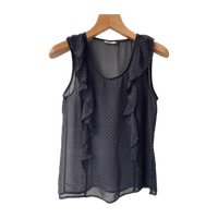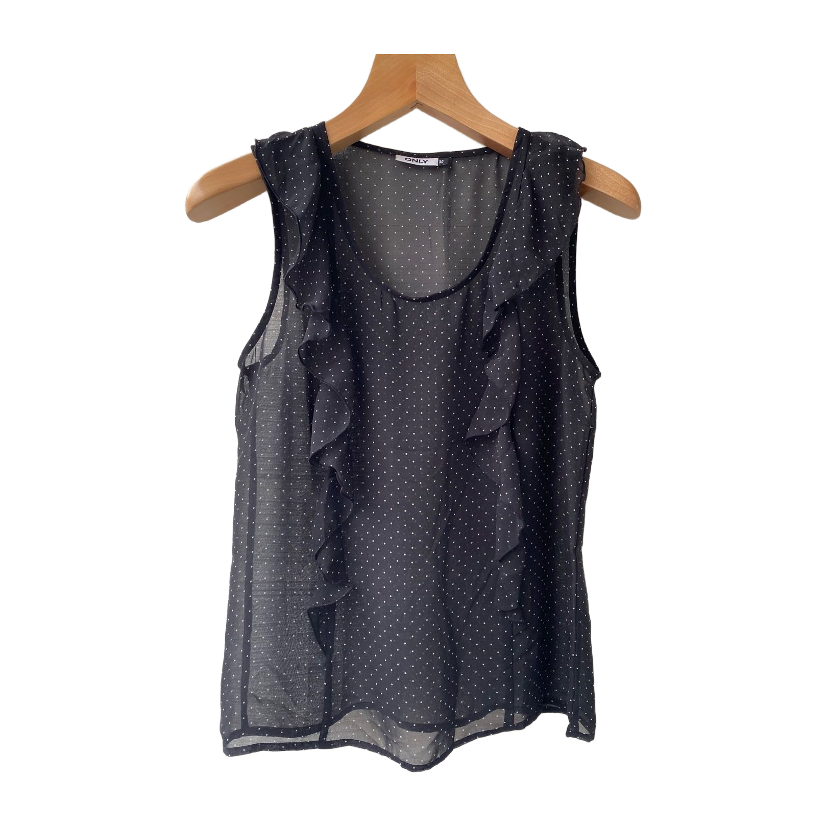 Topissa U-mallinen kaula-aukko, edestä laskeutuu kaksi röyhelöriviä. Klassinen pilkullinen kuosi, materiaali läpikuultava, mustassa värissä valkoisilla pilkuilla. Uskoisin materiaalin olevan polyesteriä. Leveä malli, saattaa sopia myös S-kokoa käyttävälle.