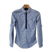 Paita on tyköistyvä, korostaa vyötäröä. Materiaali ohutta, hihat saa rullattua ylös (ks. viimeinen kuva). 1-2 kertaa käytetty, uudenveroisessa kunnossa. Löytyi vaatekaapin uumenista, paita jäänyt pieneksi.