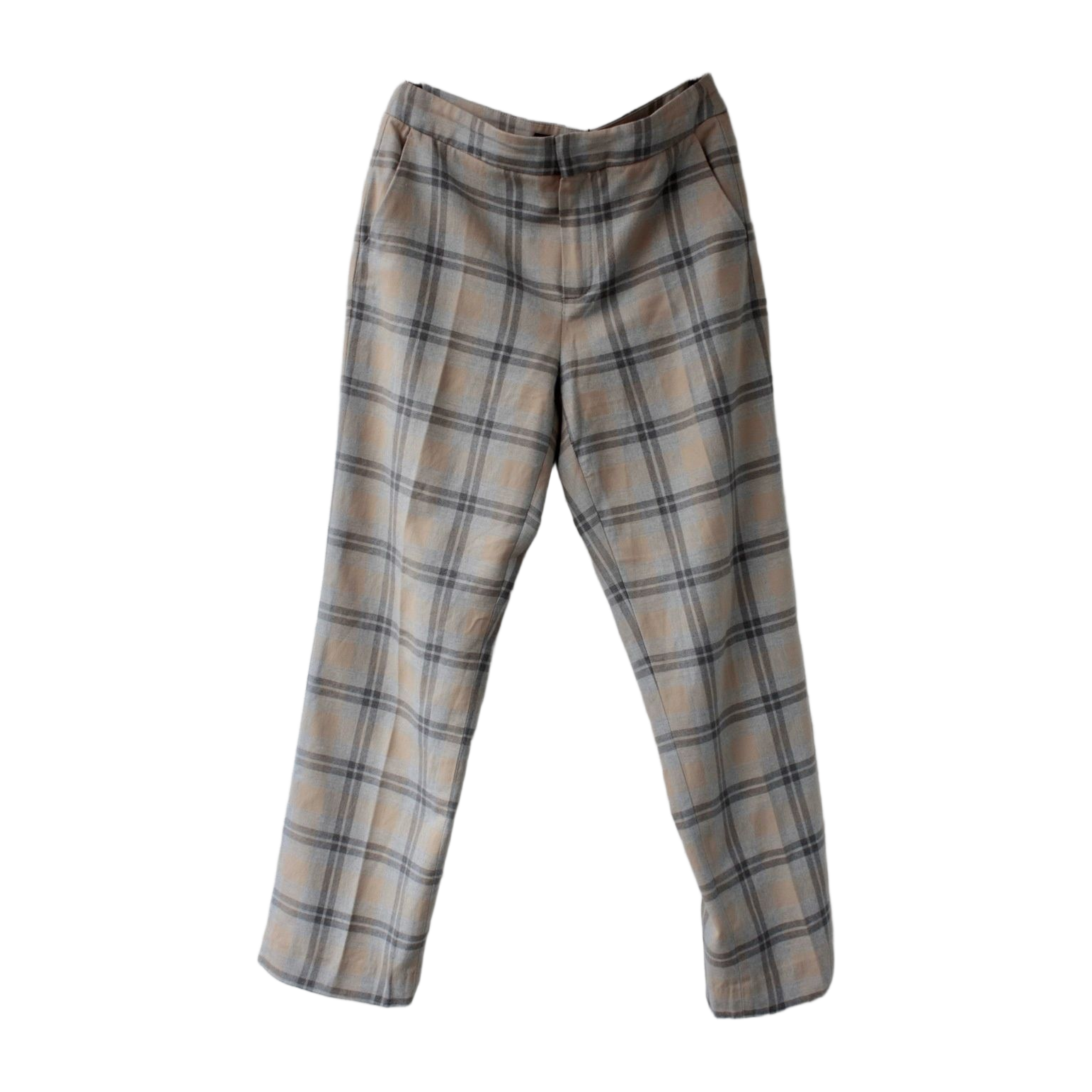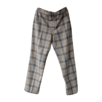 Regular waist housut kokoa 38. Suoralahkeiset, ruudullisella kuosilla. Vetoketjullinen ja napillinen kiinnitystapa (osittain näkyy 3. kuvassa). Edestä kaksi sivutaskua, takaa kaksi feikki taskua. Lahkeen sisäpituus 72 cm.