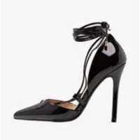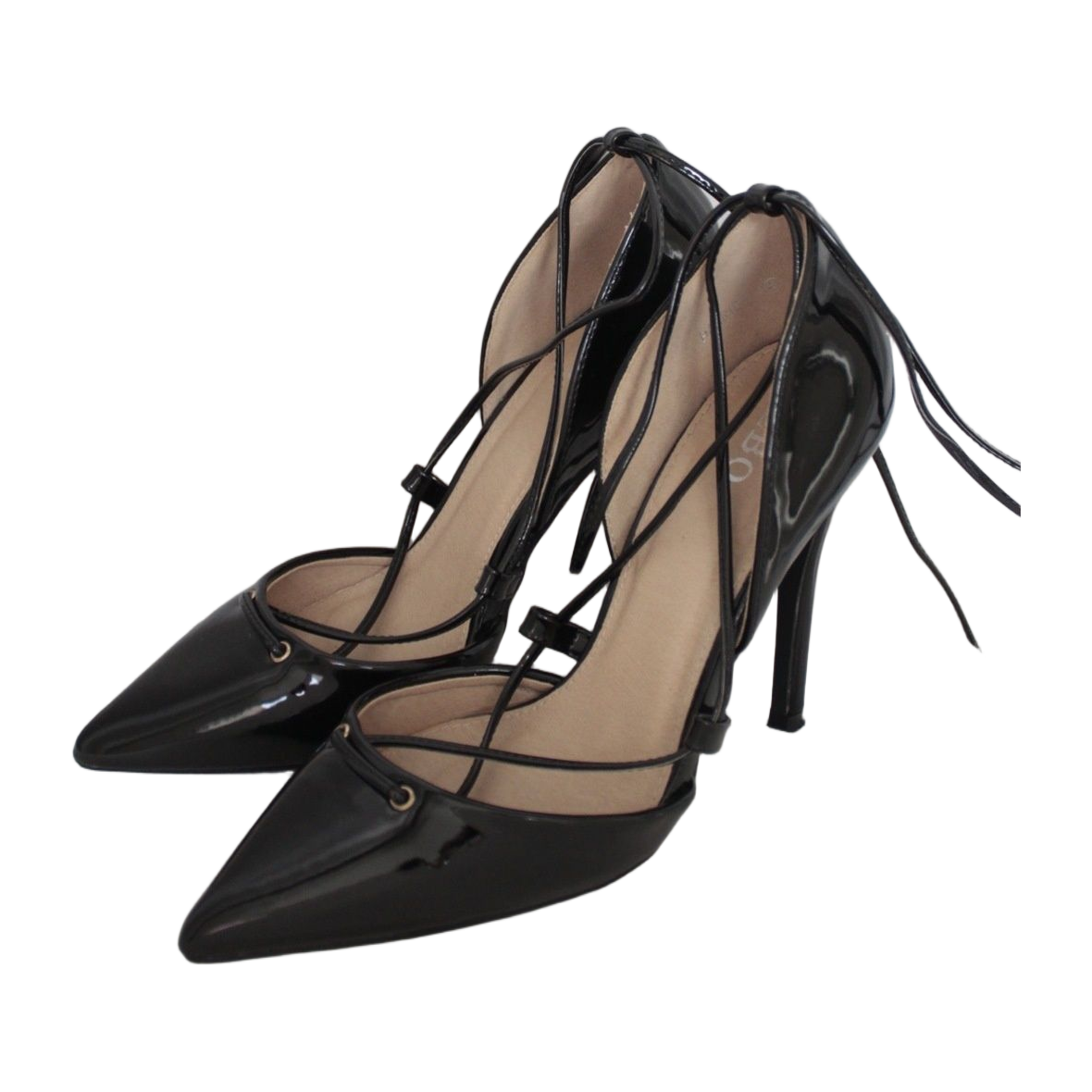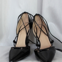 Kiiltopintaiset avokkaat, joissa takana ohut nauha, jonka voi kiertää useamman kerran nilkan ympäri. Nauhan päädyssä kultainen metallinen koristeosa (kuva 4). Mielestäni kengissä ilmoitettu 38 koko vastaa 39 kokoa. Korko n. 11,5 cm.