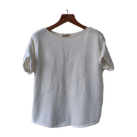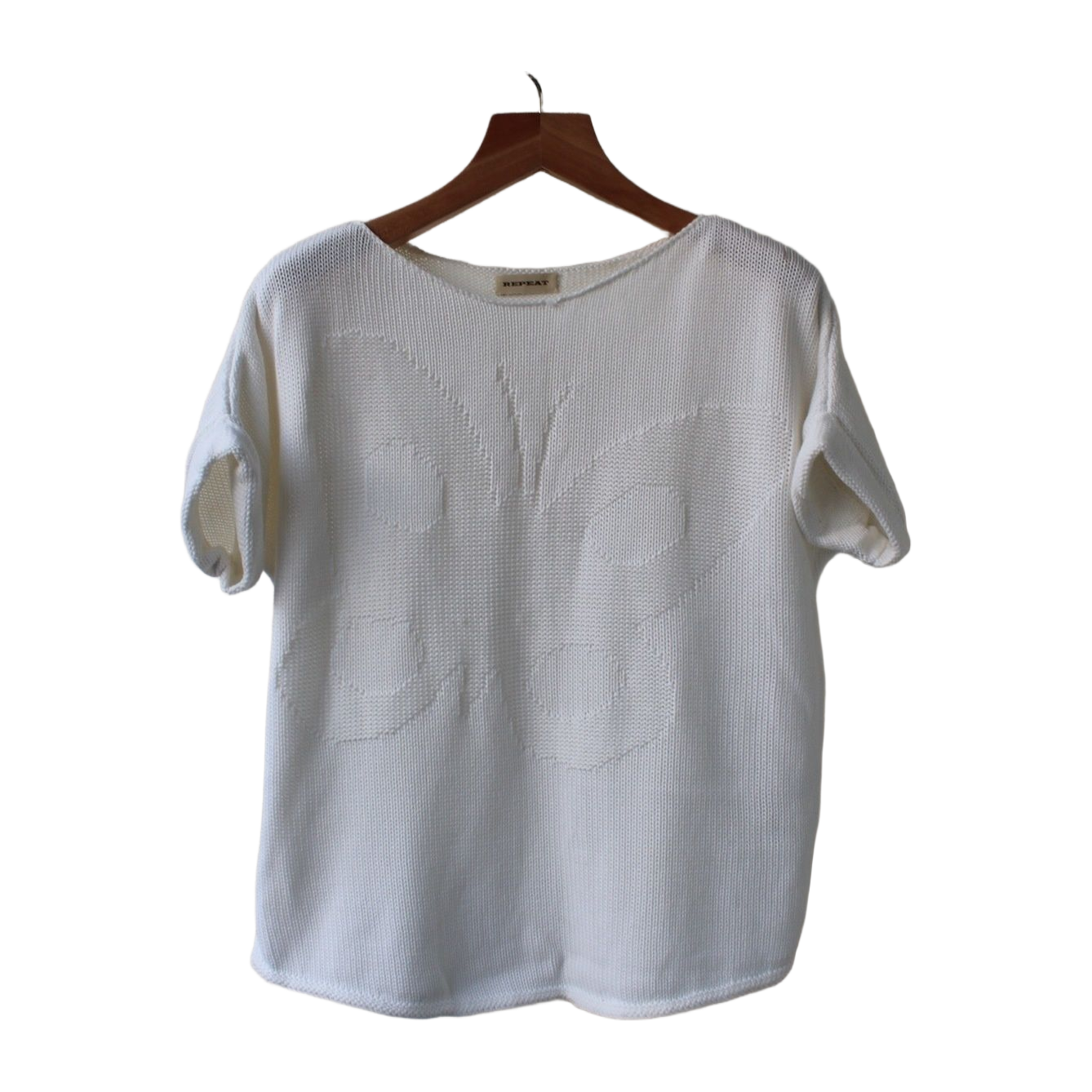 Valkoinen oversize-mallinen neule lyhyillä kärityillä hihoilla. Edestä yksityiskohtana perhonen. Materiaali laadukas ja mukava päällä 😍