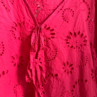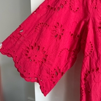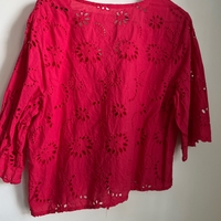 Punainen pitsipusero, jossa solmittava edusta ja 3/4 hihat.