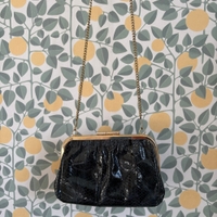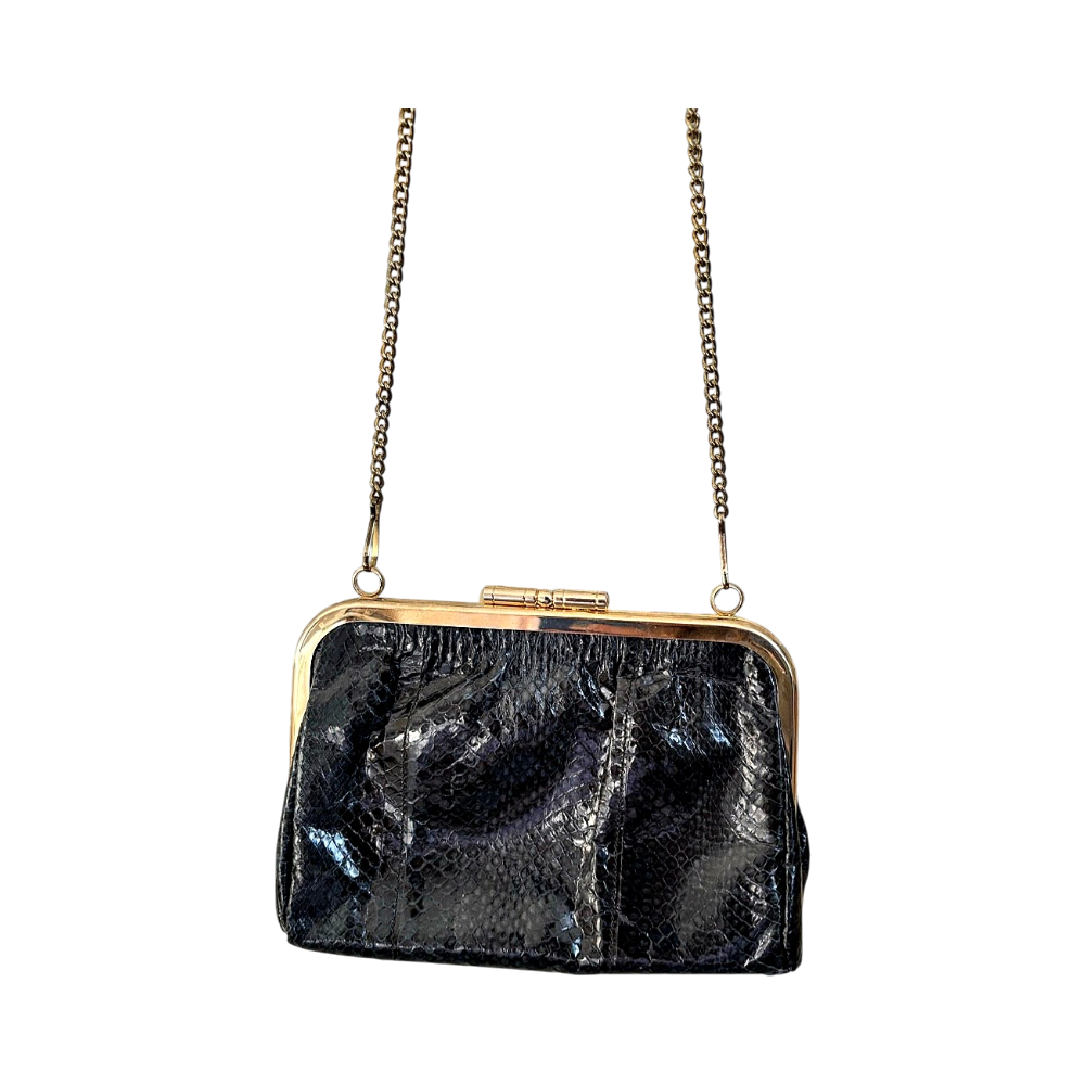 Tummansininen käärmenahkakuvioitu vintage juhlalaukku pitkällä kullanvärisellä ketjulla.