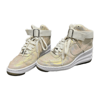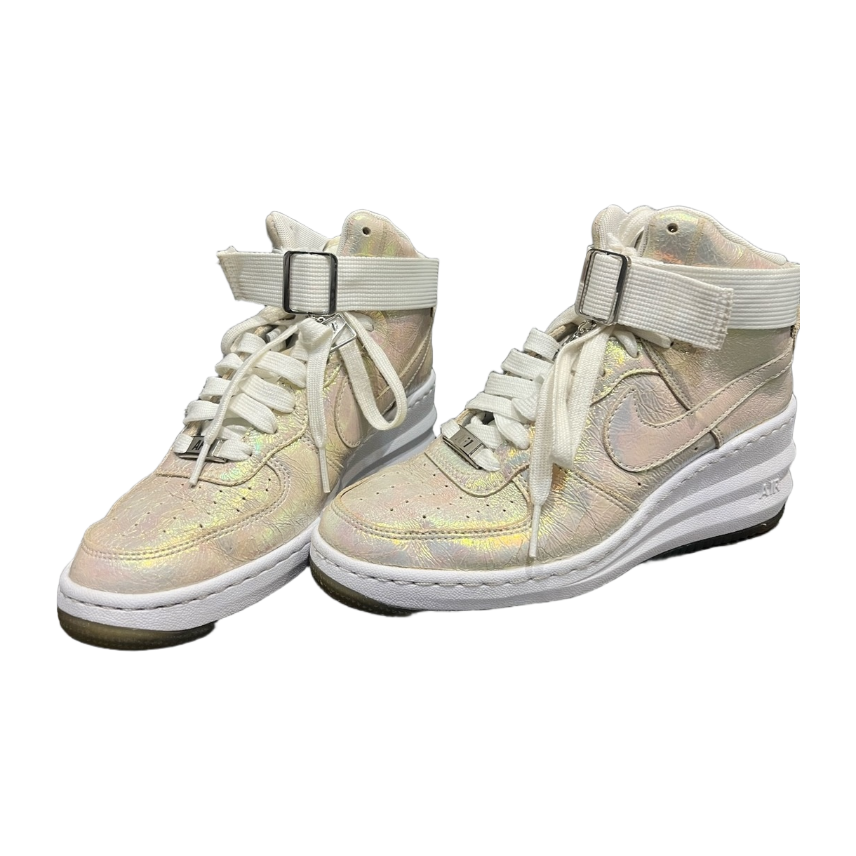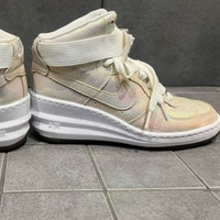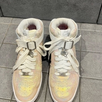 Tennarit kiilakorolla. Nauhat ja solki. Vaalea hieman väriä valon mukaan muuttava materiaali.