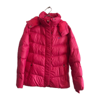 Vadelmanpunainen untuvatakki, jossa ominaisuudet kohdallaan: irrotettava huppu, lumistopparit hihansuissa, 2-suuntainen vetoketju + napitus, vetoketjulliset taskut + povitasku, kiristysnauha helmassa. Päällysmateriaali polyester, täyte väh. 75% untuvaa. Uudenveroinen.