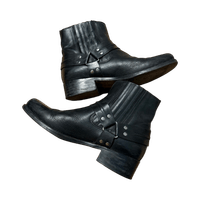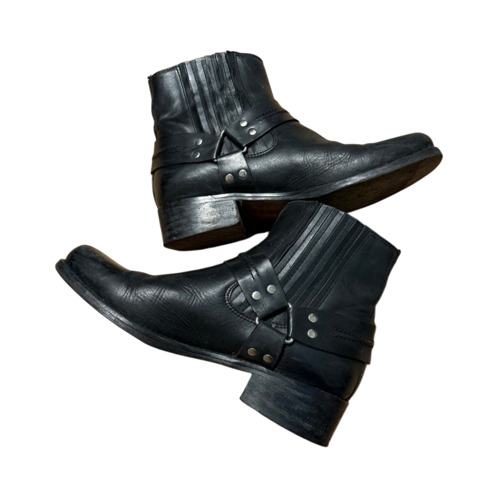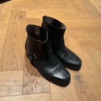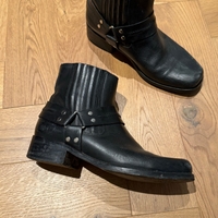 Lyhyet nahkaiset biker-saappaat, näyttävä remmi- ja niittidetail.