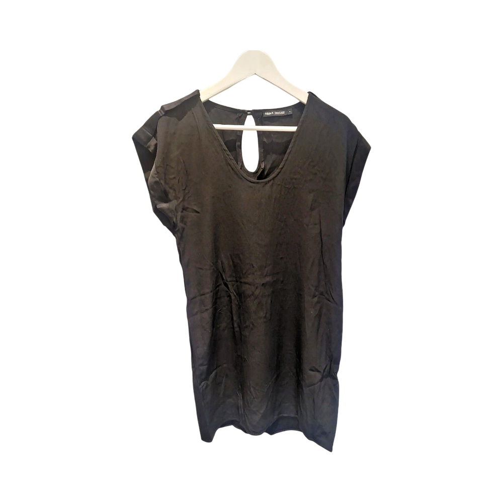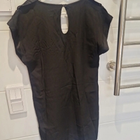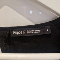 Filippa K musta mekko, koko S. 57 % asetaatti, 43% viskoosi. Mekossa on lyhyet hihat ja avonainen selkäosa, yksityiskohdat olkapäillä. Hyvässä kunnossa.