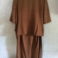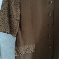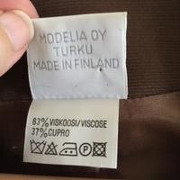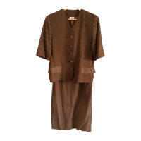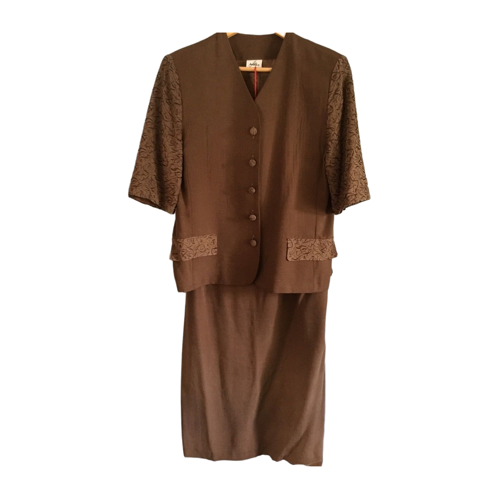 Ruskea lyhythihainen vuorillinen jakkupuku puolihameella. #vintage (irrallinen kuvassa 1 näkyvä punainen naru ripustusta varten). Hameen helman korkeus 70cm, vyötärö 80 cm ja takana halkio 17 cm. Jakun hihan pituus 36 cm ja kainalo-kainalo 52 cm.