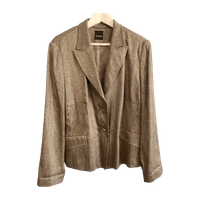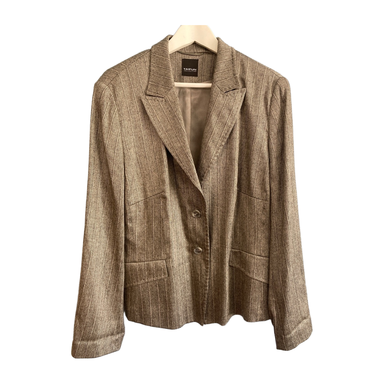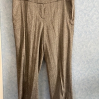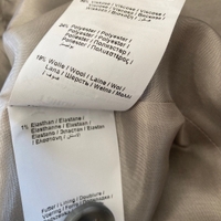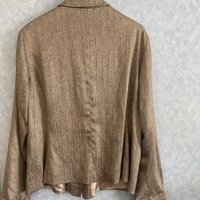 Harmaa, hiilityn raidallinen housupuku, takki kokoa 46 ja housut kokoa 44. Housun lahkeet itse lyhennetty, huomiotu kuntoluokituksessa. Muuten hyvä kunto.