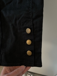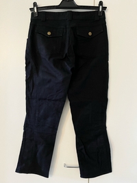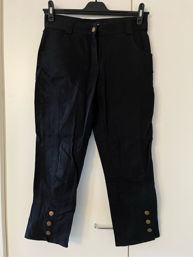 Mustat lyhytlahkeiset / capri farkut koossa 36. Lahkeissa yksityiskohdat napeilla, takana ja sivuilla taskut. Vyötärö 78cm ja lahkeen pituus 63cm. Käytetty mutta edelleen hyvässä kunnossa