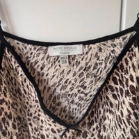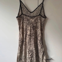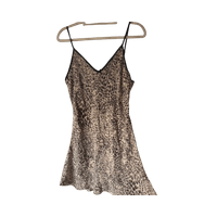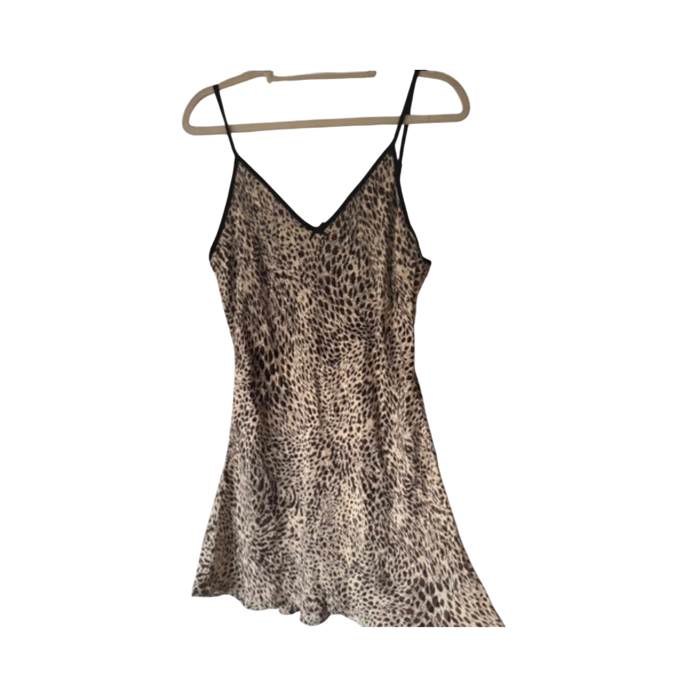 Beige leopard slip dress with black trim and thin straps.