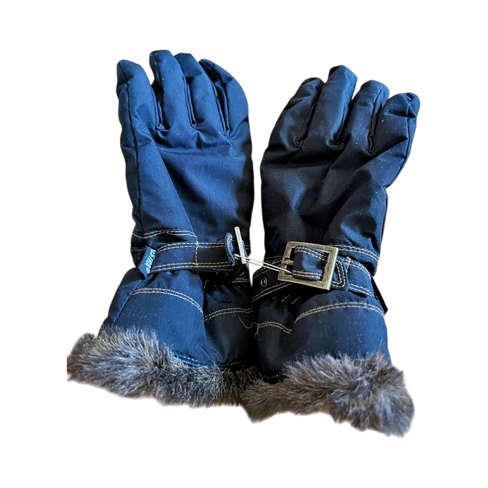 Lämpimät mustat lasten talvihanskat tekoturkisreunuksella ja soljella.