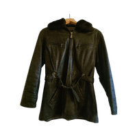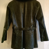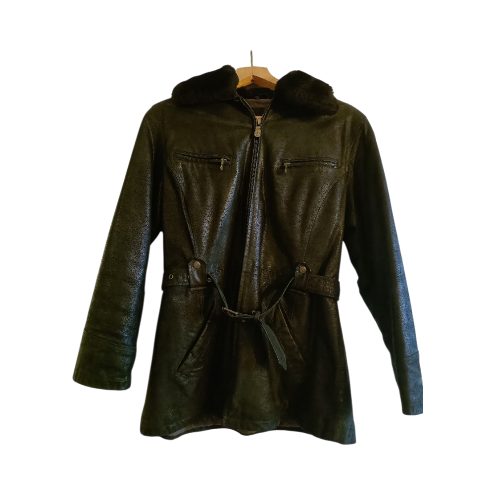 Pitkä musta nahkatakki, vyö ja karvakaulus.