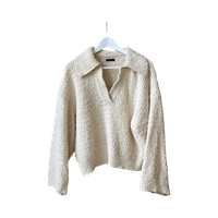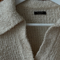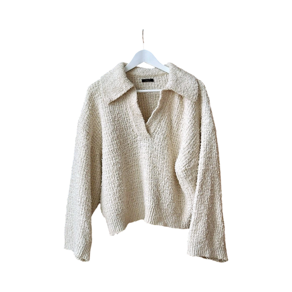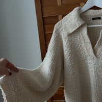 Luonnonvalkoinen neulepusero kauluksella, pehmeä materiaali. Koko L, mutta menee S-M kokoiselle hieman oversize istuvuudella kivasti