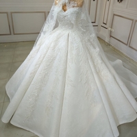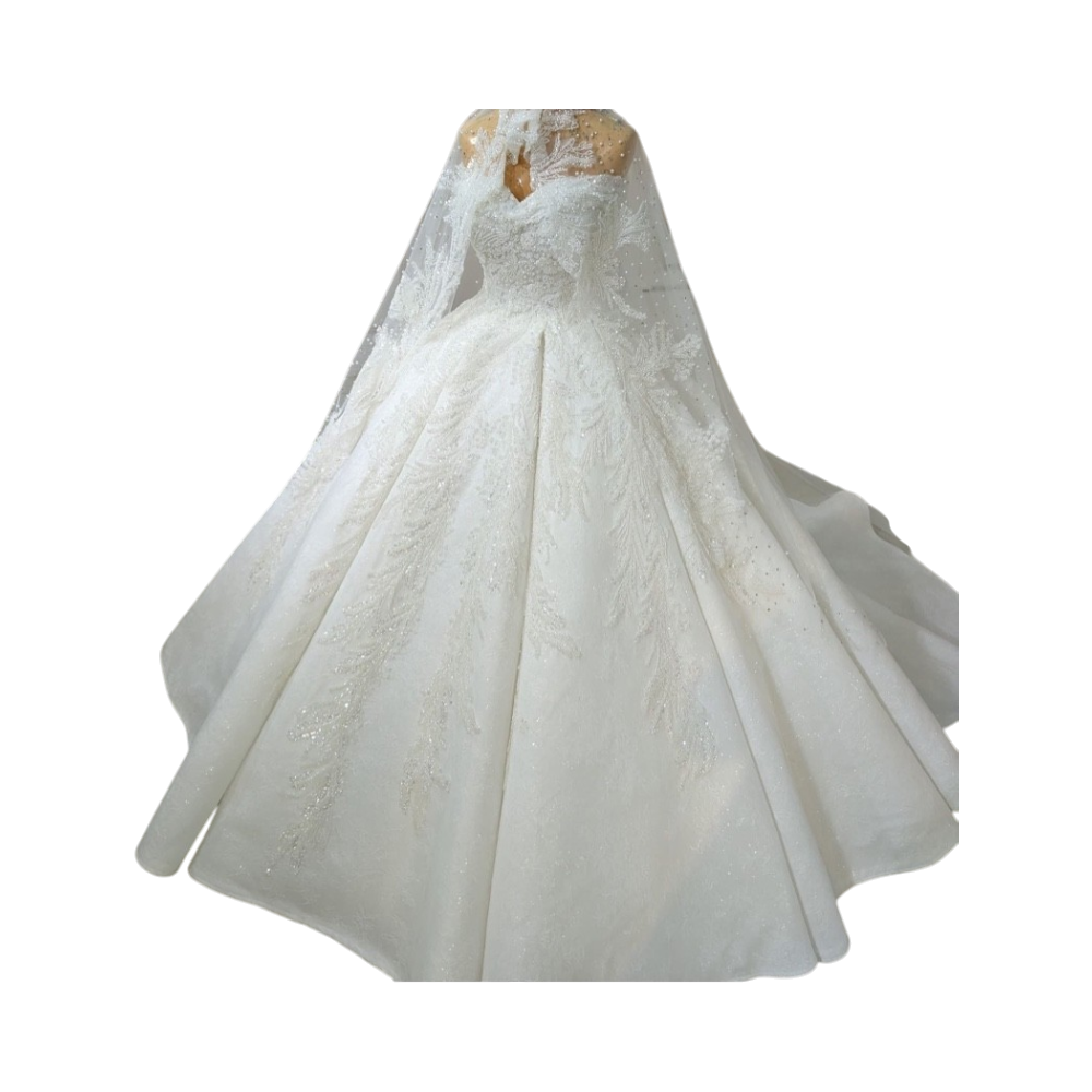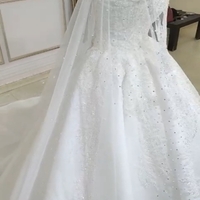 Valkoinen, tyllinen olkaimeton prinsessamekko helmikoristein.