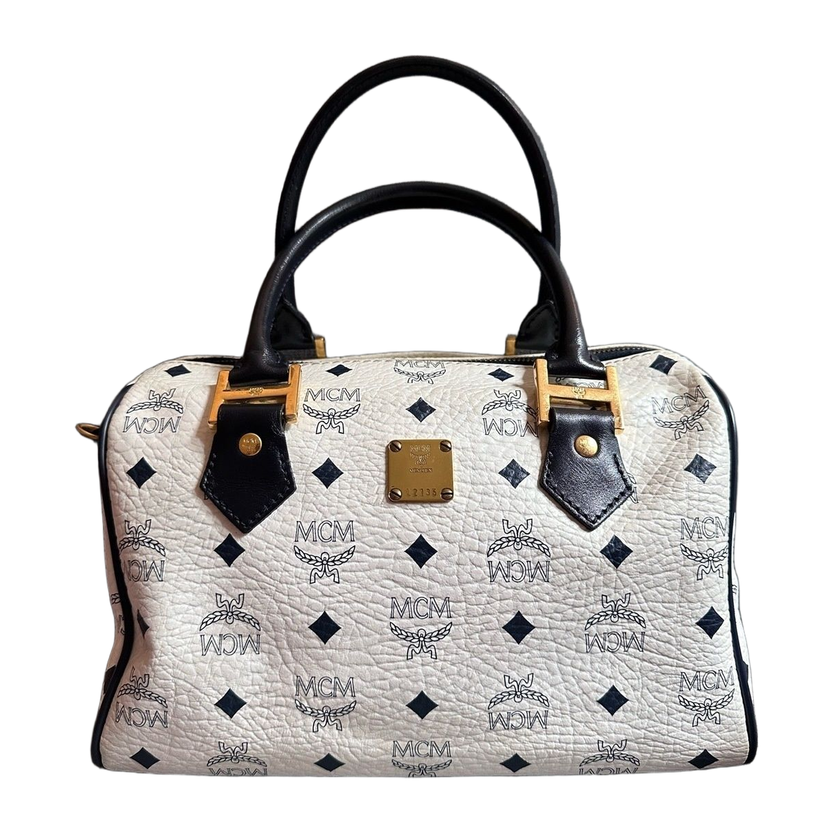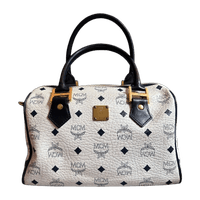 MCM logo boston bag. The bag is in very good condition. There are some tarnish on the hardware. The handle is in excellent condition. There is no cracking or rubbing. All corners are also good. There are 5 feet on the bottom.