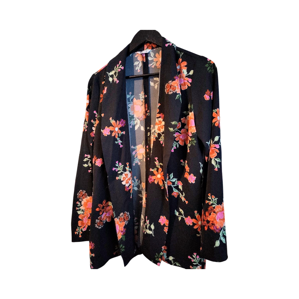 Hihaton musta takki, jossa värikkäät kukkakuosit. Sopii kesä- tai kevätiltoihin.