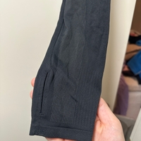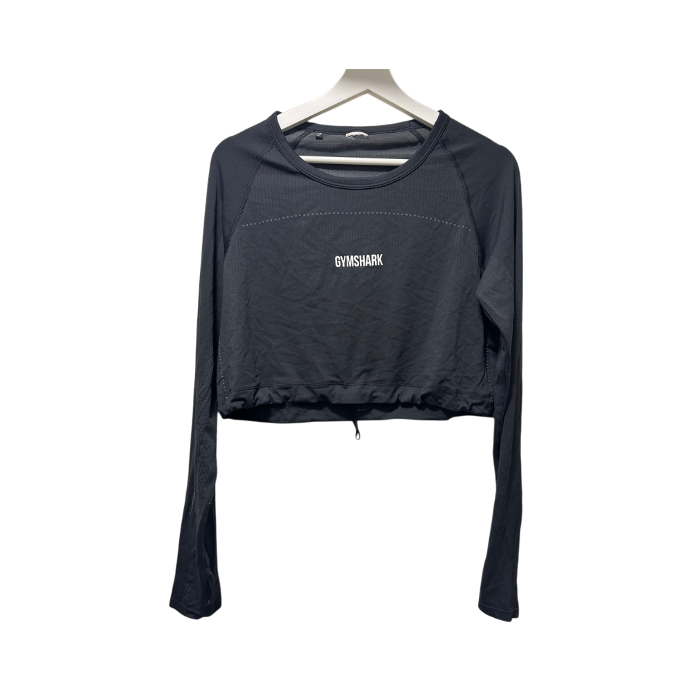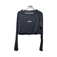 Musta crop top -treenipaita, pitkät hihat, kiristysnauha helmassa ja peukalonreijät