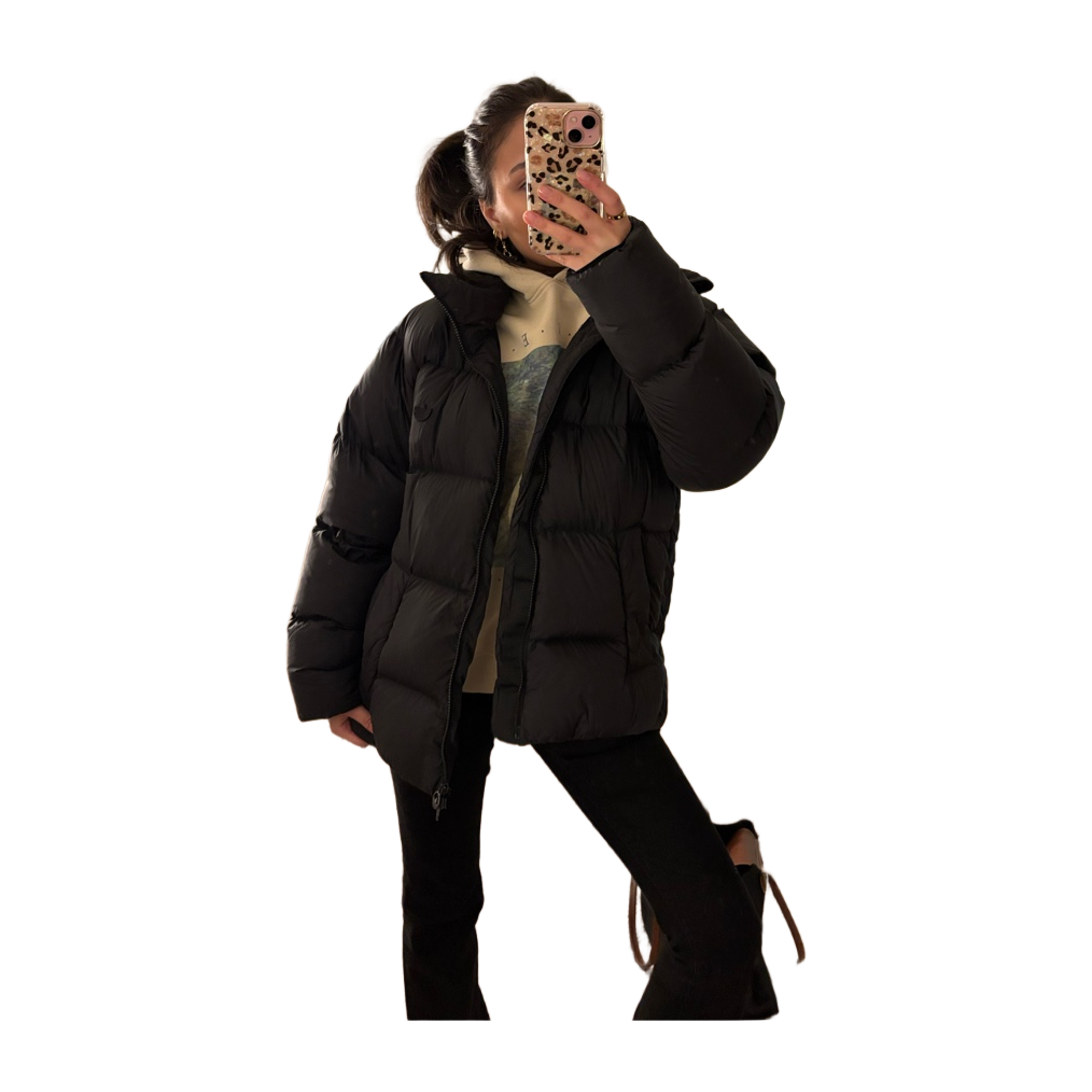 Adidaksen musta untuvatakki, lämmin ja tyylikäs oversize malli.