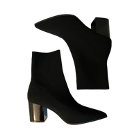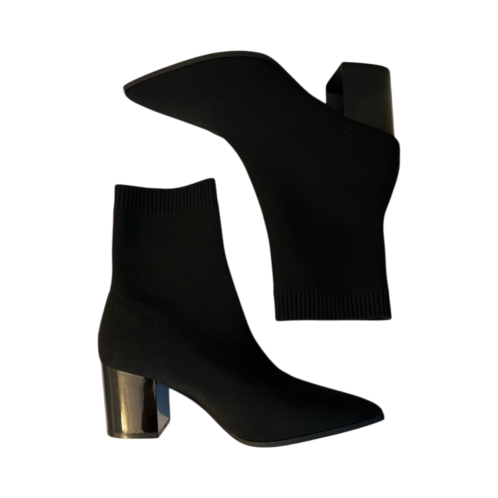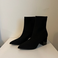 Nilkkapituiset kärjelliset stretch-sukkasaappaat, korko noin 6 cm.