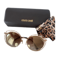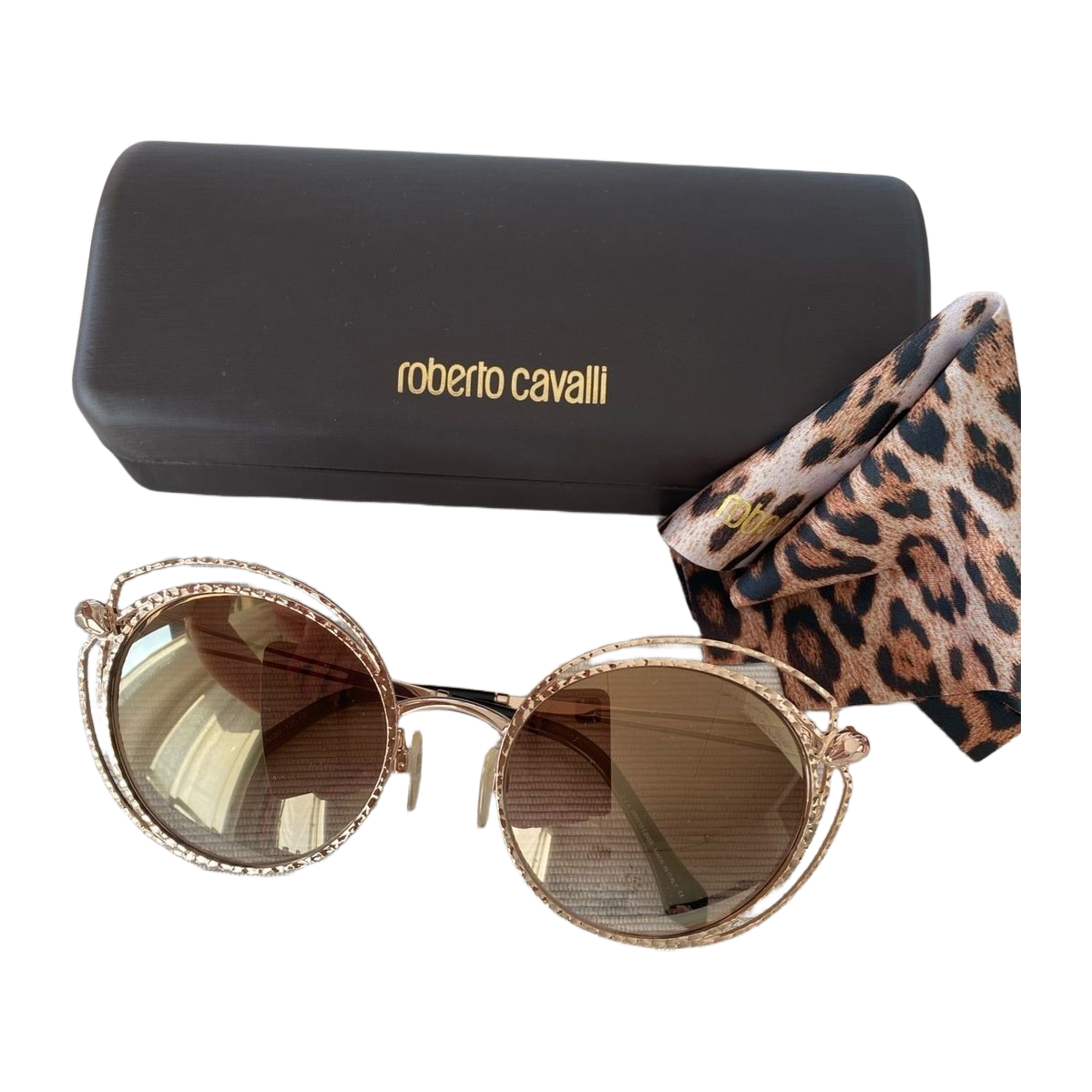 Gorgeous feminine sunglasses by Roberto Cavalli. Golden frame with snake detail in front frame and logo on side. Lenses with mirror effect. Used only couple of times, looks like new!