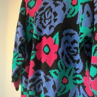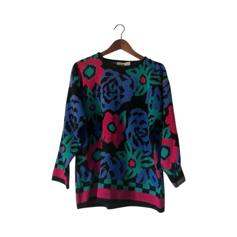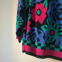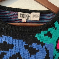 Super fun and retro knitted sweater in good condition. There is a slight bit of unraveling on the left shoulder, but it is otherwise in perfect condition. 100% acrylic so it will keep you so warm in the winter. Originally bought in Philadelphia. Size M but it's so oversized it could fit L as well.