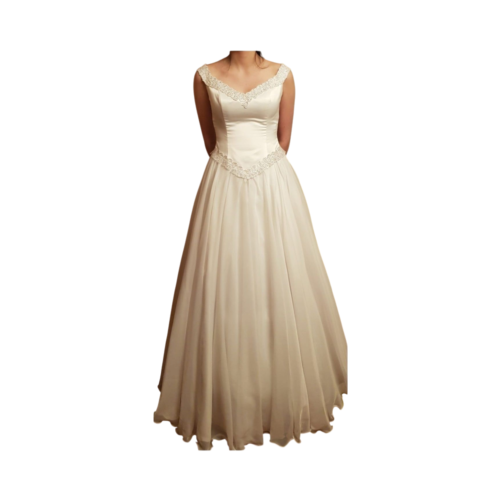 Tyylikäs vintage häämekko, joka ollut vanhojen tansseissa. Kaulassa ja vyötärössä on glitteri pitsi nauha. Sopii sirolle 165cm naiselle noin 5-6 cm koroilla. Mukaan saa vannealushameen.
