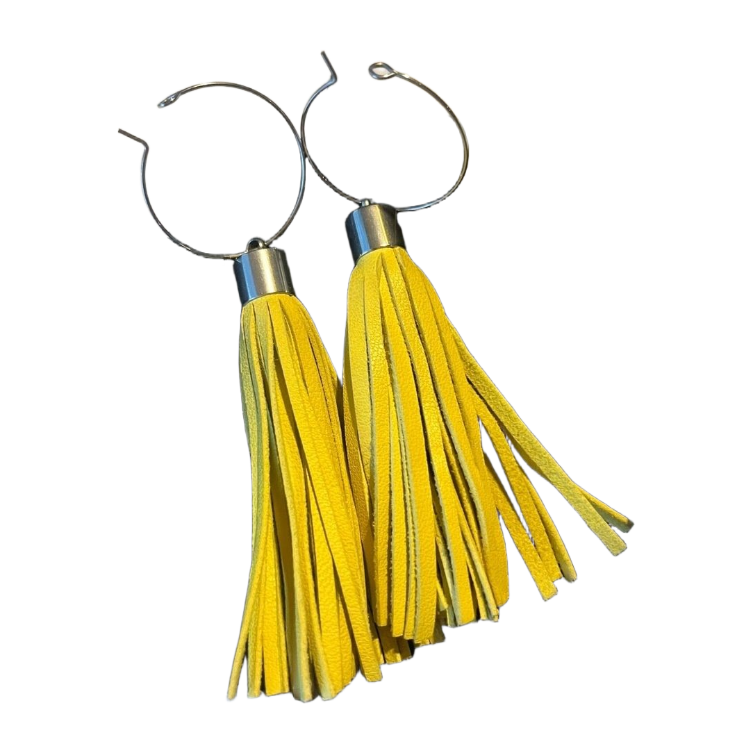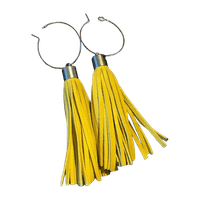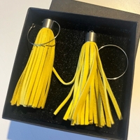 Ihanan kevyet YCM-tupsukorvikset. Materiaali nahkaa. Tupsun pituus 7 cm (voi lyhentää itse) ja lisäksi ohut rengas kirurgin terästä.