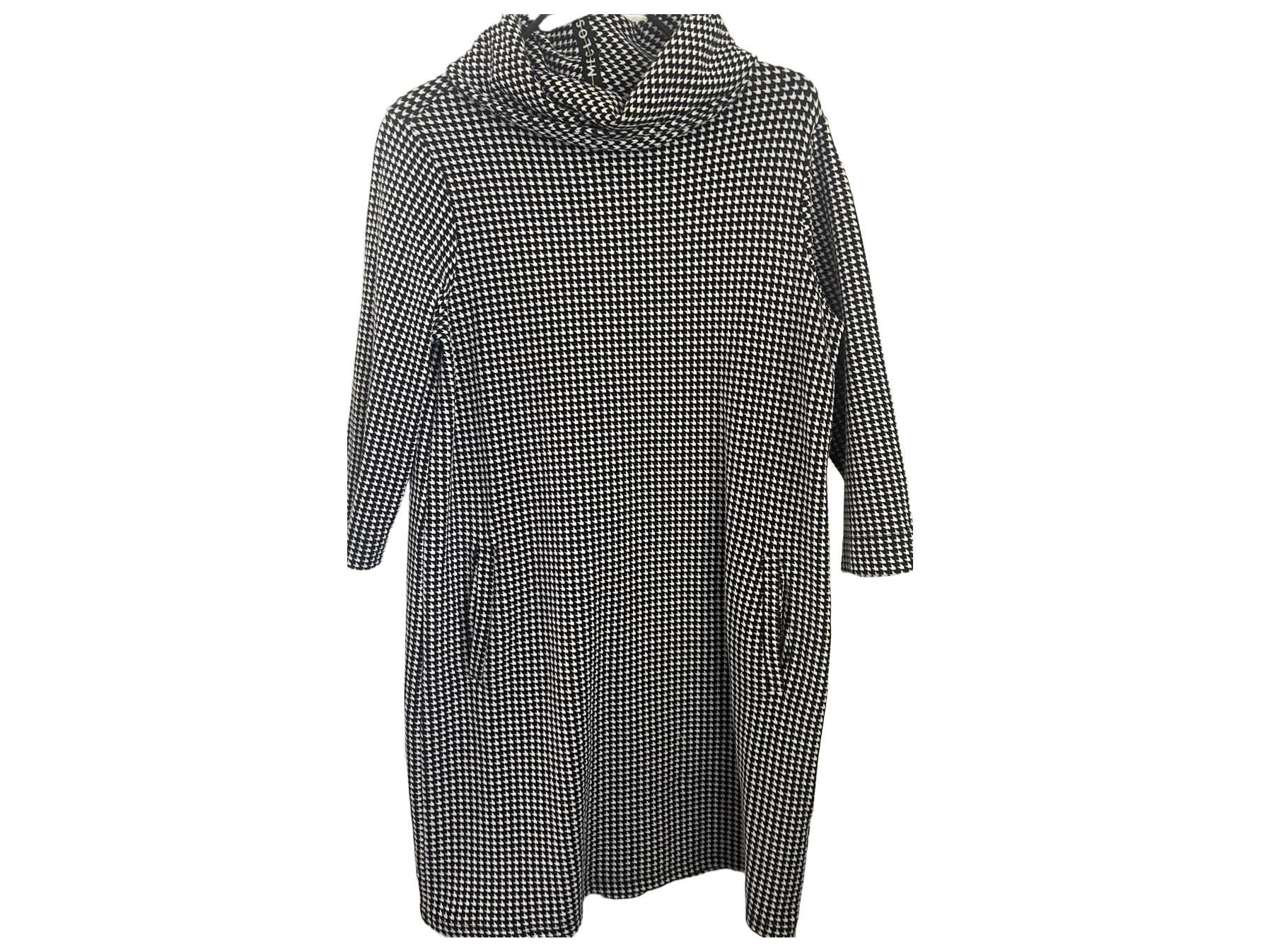 Pitkä hihainen houndstooth-kuvioitu mekko, kiva kaulus, jossa sporttinen merkkinauha takana.