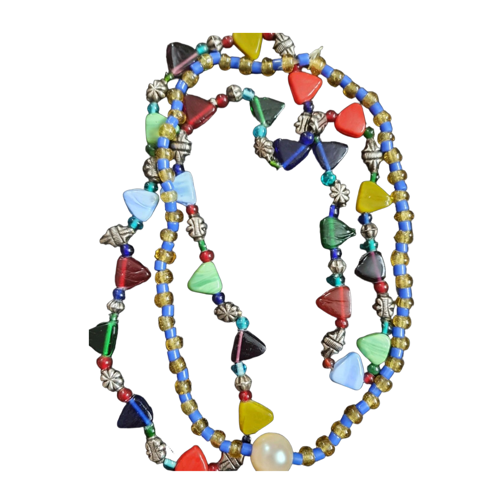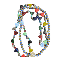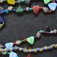 Värikkäät kaulakorut x2. Pidemmässä kolmion muotoisia lasikiviä ja metallikoristeita, pituus kaksinkerroin n.50cm.