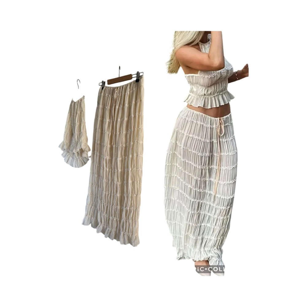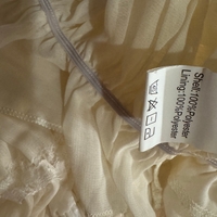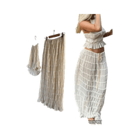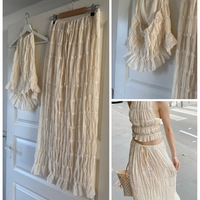 Kevyt, rypytetty beige maksihame, joustava vyötärö ja vuori.