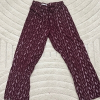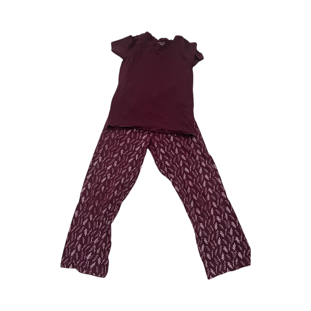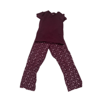 Two-piece burgundy pajama set; short sleeve top and printed pants.